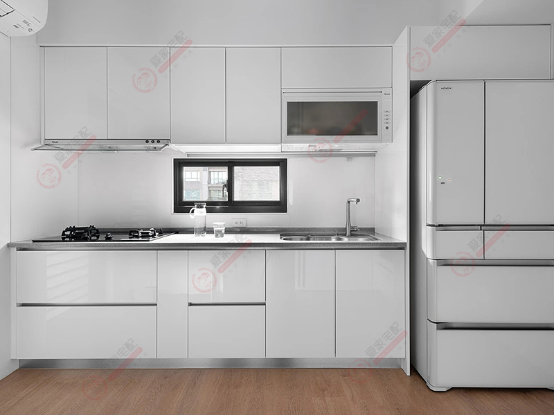 五、厨房装修技巧白色橱柜与环境融为一体。小户型整体厨房的色彩,应以单色调、浅色系为主;装修上特别注意不能使用印有立体感图案或明暗对比强烈的装饰材料,否则不仅会使厨房面积在视觉上显得狭小,而且不易清洁。在白色装修的整体环境中,选用亮面白色橱柜,能够将两者充分融合在一起,视觉上产生一体感。